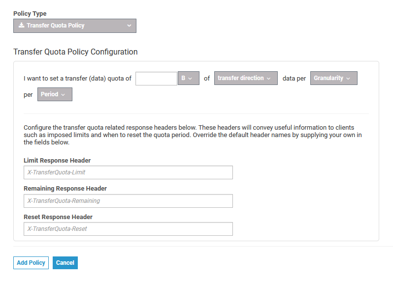 | Remaining Response Header | String | Optional. HTTP response header that API Management will use to store how many requests remain before the limit is reached. | - | X-TransferQuota-Remaining |