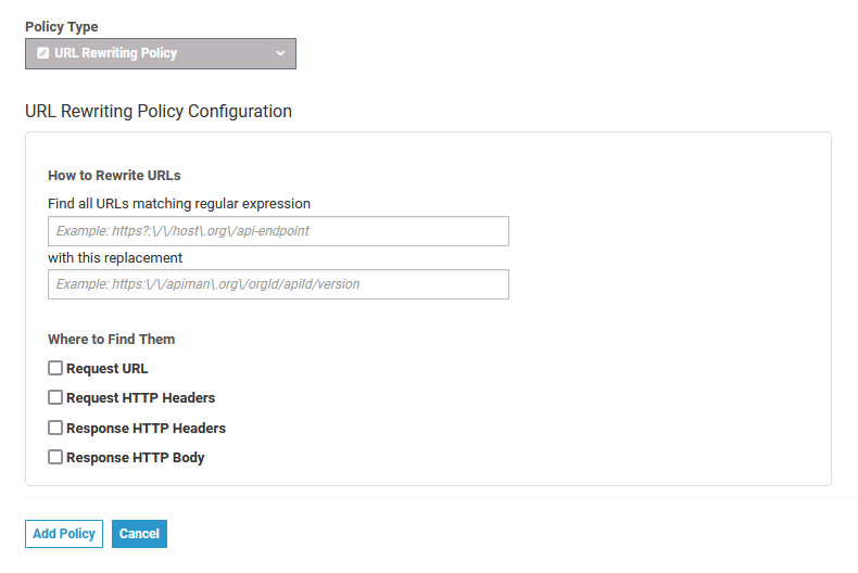 The URL Rewriting Policy is used to re-write responses from the backend API such as they will be modified by fixing up any incorrect URLs found with modified ones. As the API Management works through an API gateway, in some cases an API might return URLs to followup action or data endpoints. In these cases the backend API will likely be configured to return a URL pointing to the unmanaged API endpoint. This policy can fix up those URL references so that they point to the managed API endpoint instead.
