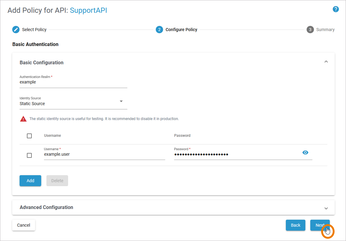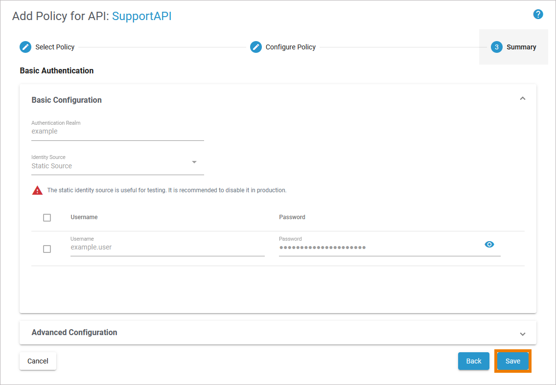 In the second step, the configuration options of the selected policy are displayed. Configure the necessary settings.