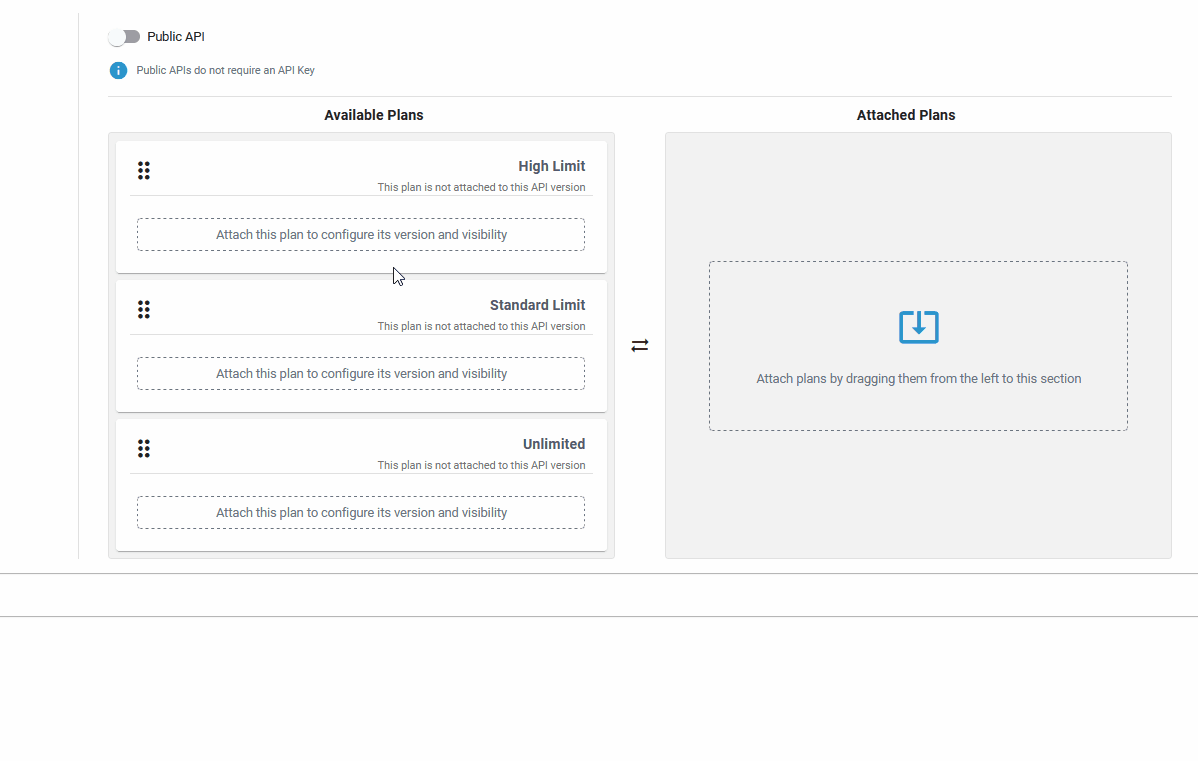 If option Public API is disabled, you need to attach at least one plan to the API. All plans that are available in the corresponding organization are displayed below: