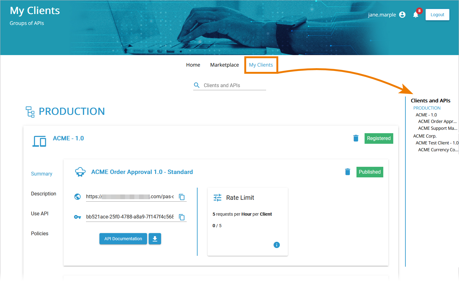All users can create and manage contracts in the API Developer Portal. If you are looking for the contracts that have been created for your clients, go to tab My Clients in the API Developer Portal. It shows a list of contracts that you have created for APIs, sorted by clients: