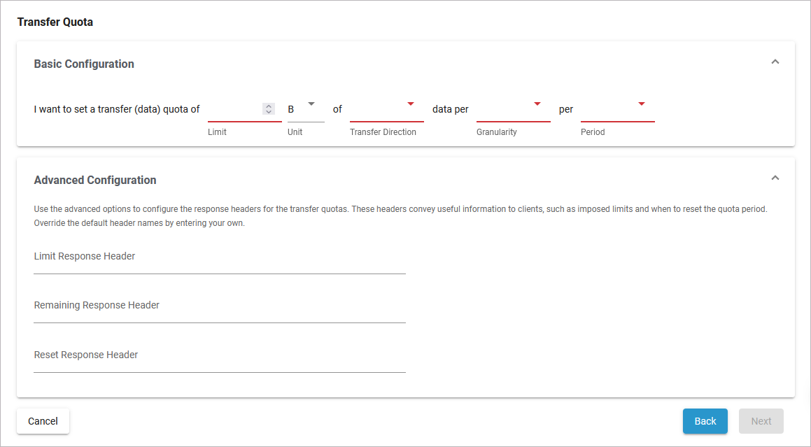 Use the advanced options to configure the response headers for the transfer quotas. These headers convey useful information to clients, such as imposed limits and when to reset the quota period. Override the default header names by entering your own.