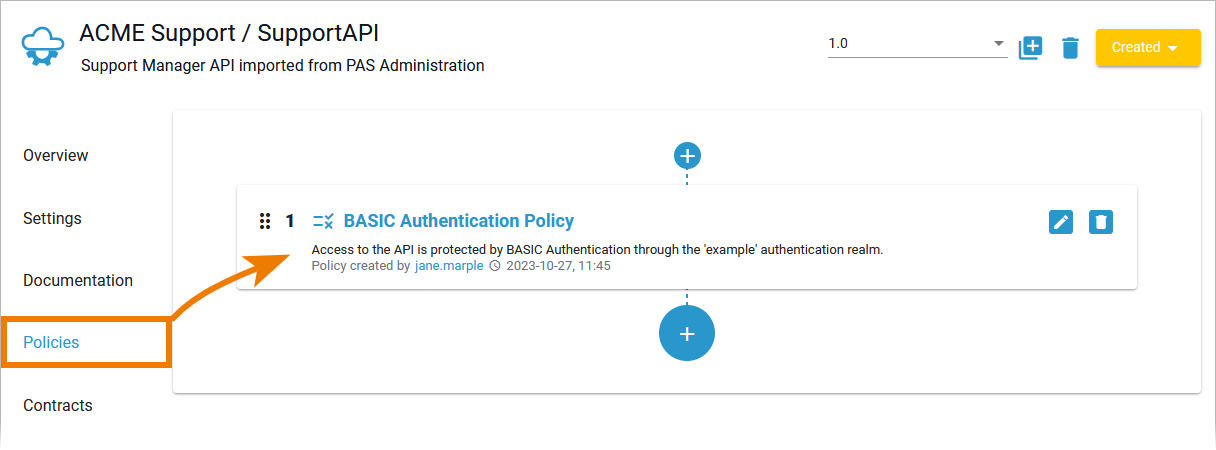 If policies have already been attached to the entity, the Policies tab displays the policies and various plus buttons to add policies.