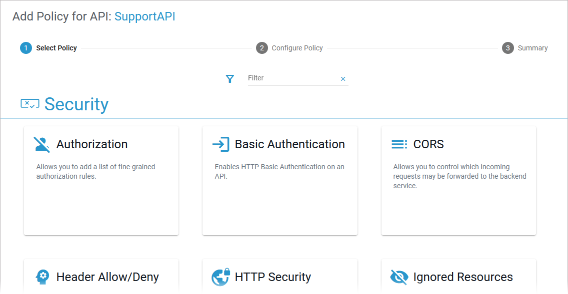 In the first step, you need to select a policy. You can scroll down to browse the page, which displays all available policies by category: