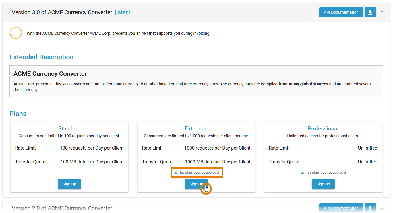 In the Plans section, you find all available plans for the API and information on whether approval is required for a plan. Click Sign Up on the plan you want to register for:
