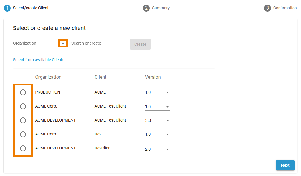 If your user has permission to use or create clients in various organizations, a different view will be displayed: