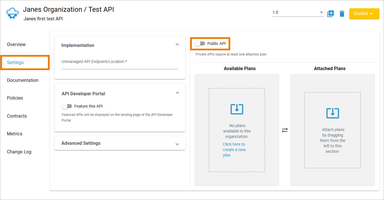 After a successful creation, you will be taken to tab Settings of the API details page where you can start to configure your API. Newly created APIs are always of type private: