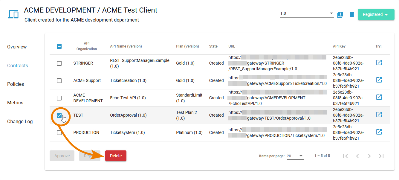 Deleting a contract will erase the contract from the client. The client will no longer be able to consume the linked API. A user has several options to delete a contract:
