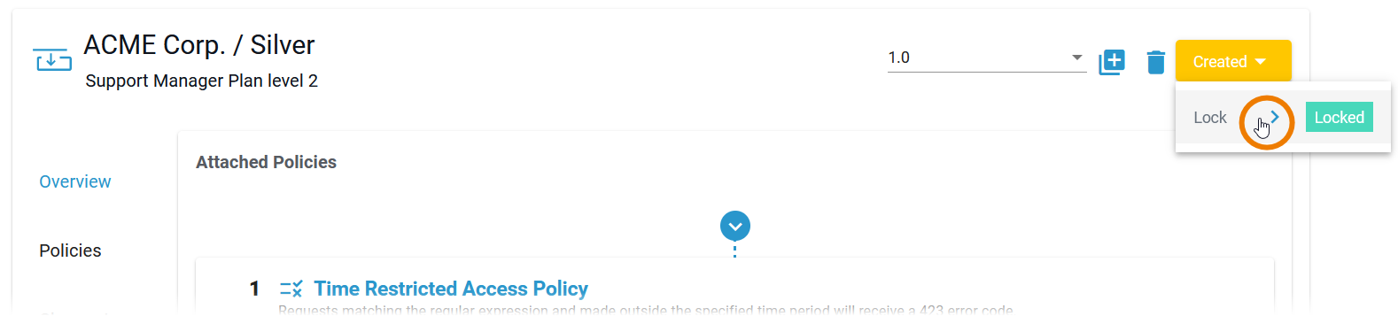 Locking the plan will prevent all future policy changes, and make the plan available for use by APIs. The new status of the plan is displayed in the basic settings: