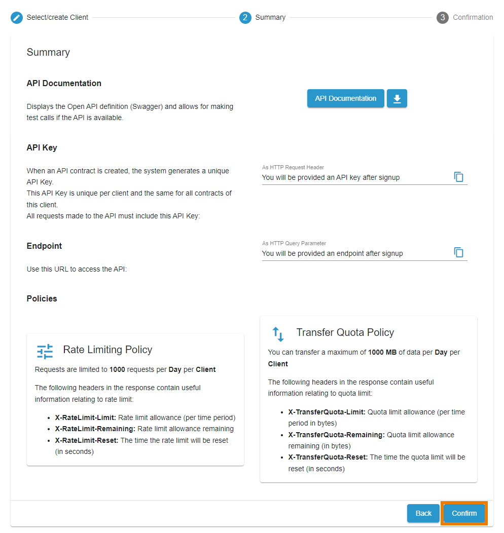 In step 2, the summary displays the API-related information. Click Confirm to send your request.