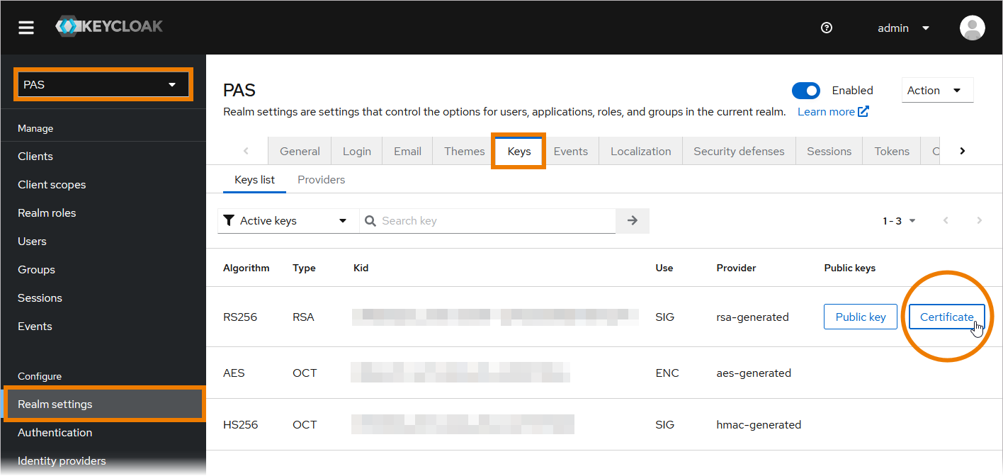 You will find the secret of the client in the PAS realm: Clients > Credentials > Client Authenticator: Client Id and Secret > Client secret