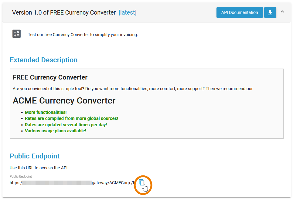Unlike Private APIs, you can use Public APIs directly. The public endpoint of the API is displayed below the API description. Click Copy to copy the URL to the clipboard: