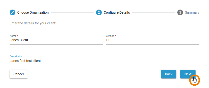 In the first step, select the organization in which the client should be created:
