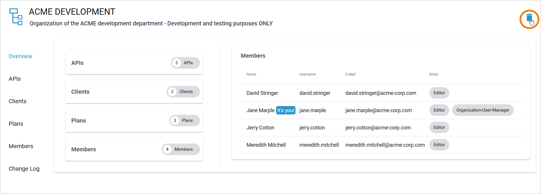 Since an organization is the container for all other elements such as plans, clients and APIs, you will have to confirm, that you want to delete the organization.Option Delete is only enabled if you activate the checkbox: