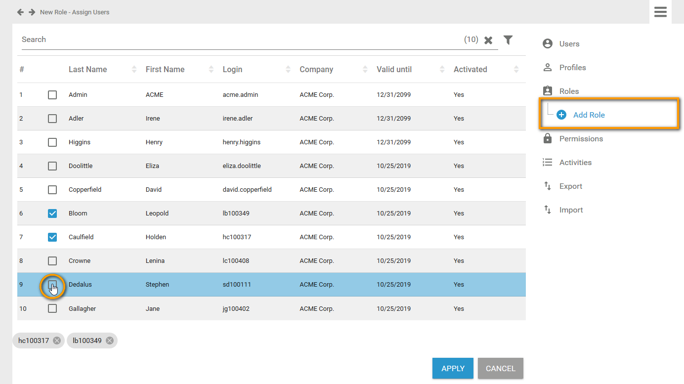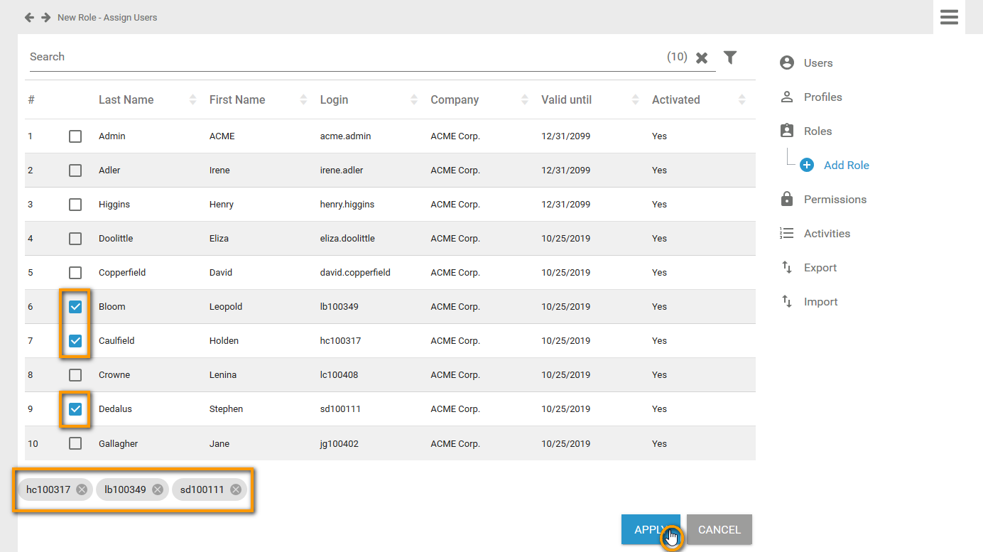 All chosen users are displayed in the footer of the list. Click Apply to assign the users to the role: