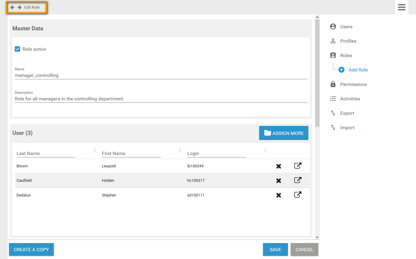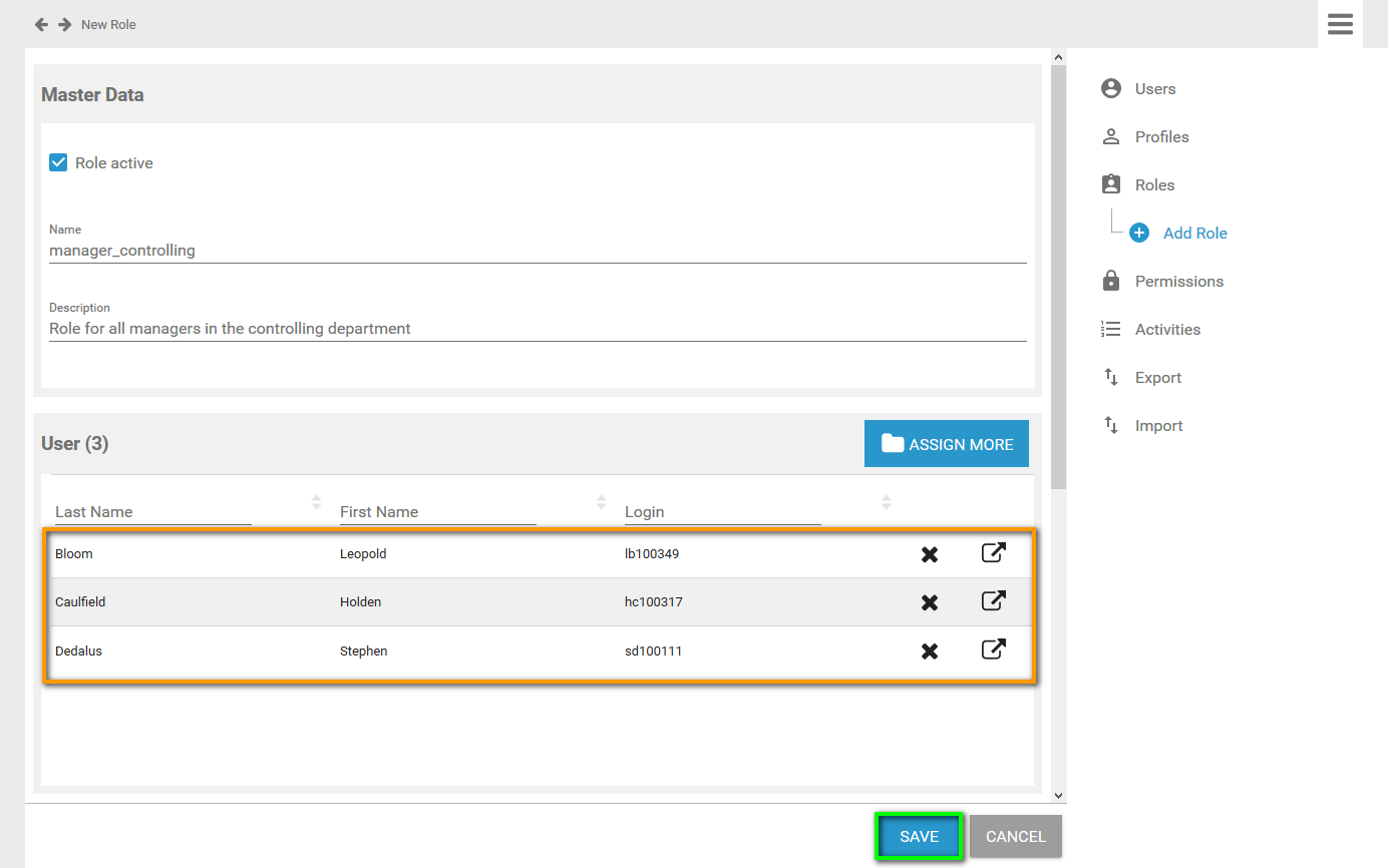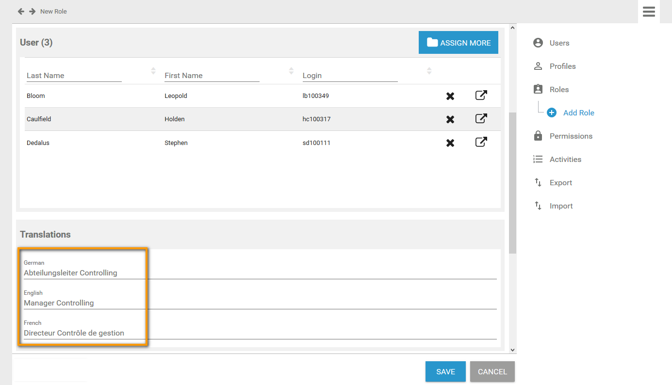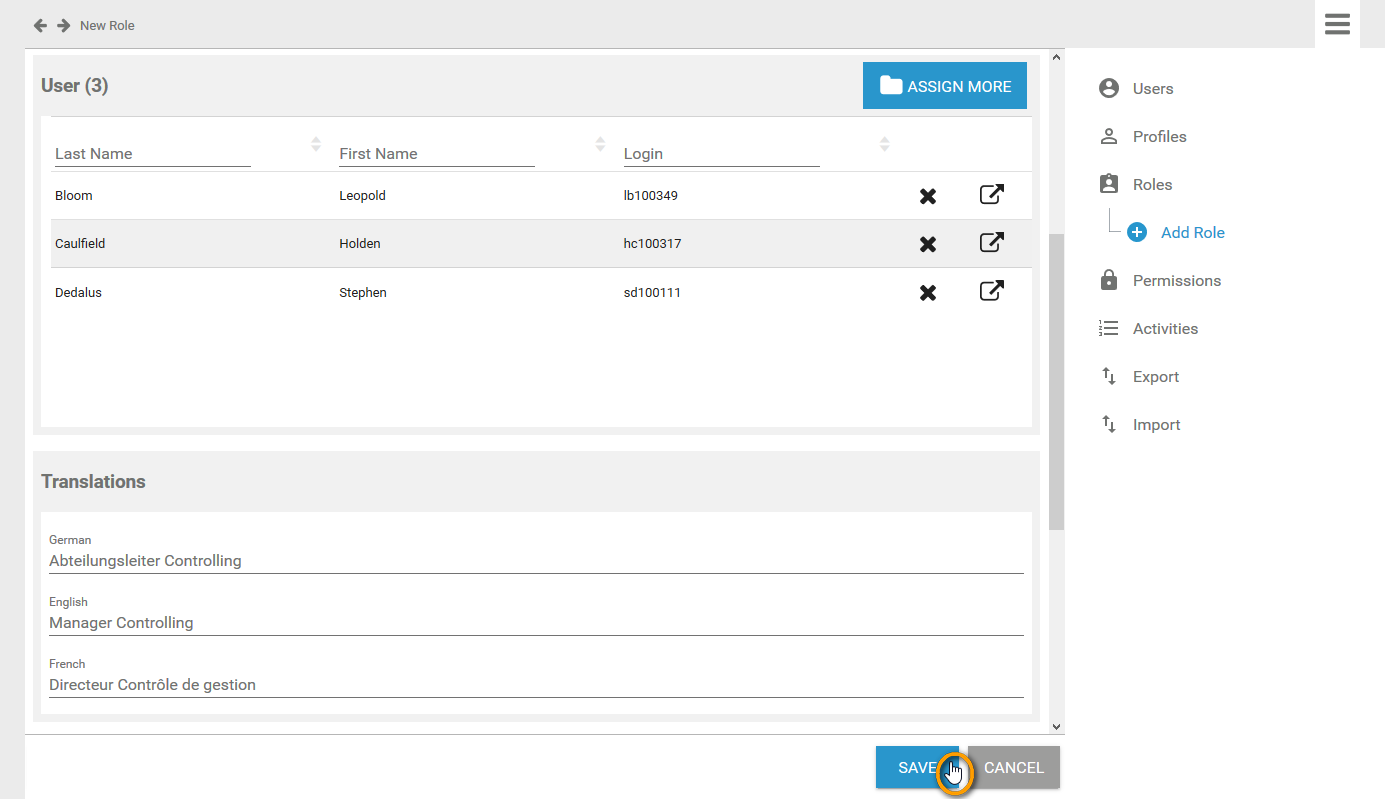When all necessary users have been assigned, you can save the role data sheet or continue to edit the role by inserting translations.