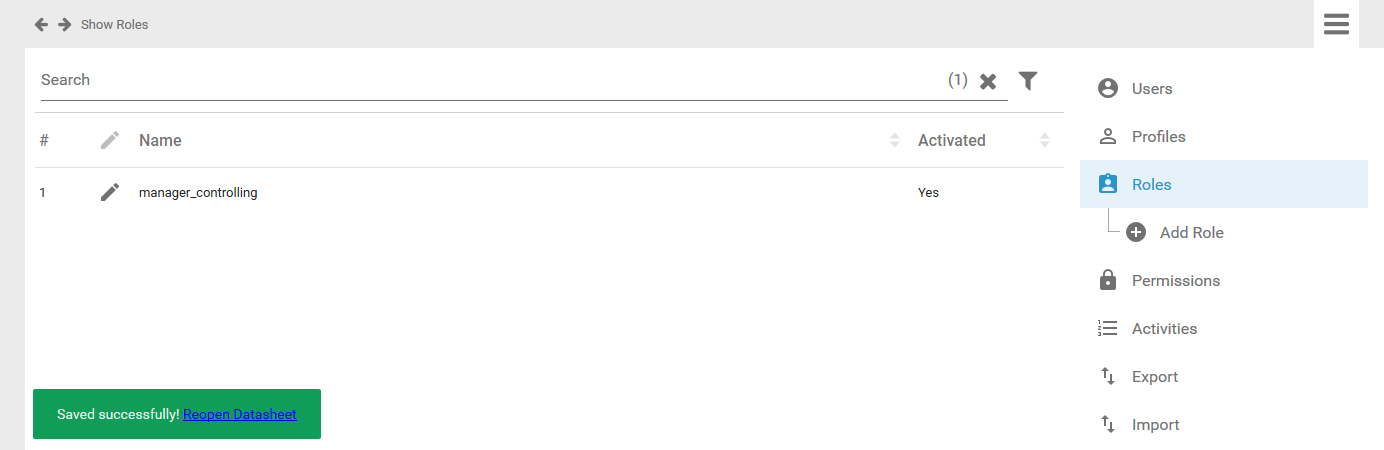 The new role is created and displayed in the list of available roles. A message Saved successfully! Reopen Datasheet appears: