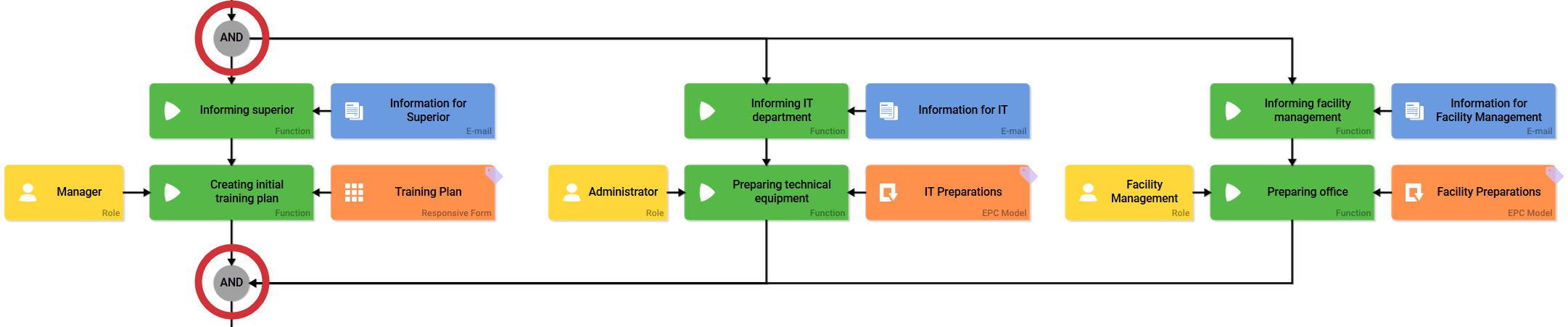 To enable parallel execution, the sub-EPC IT Preparations also contains further AND branches. The opening and closing AND connectors are modeled in the sub-EPC: