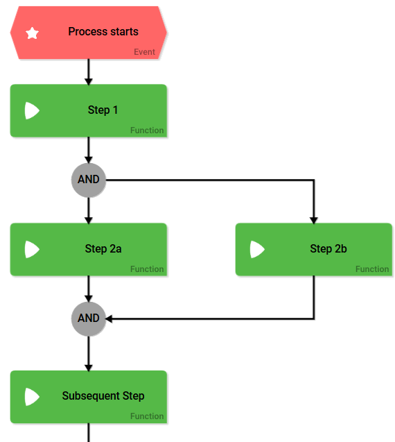 Use the AND branching to enable independent, simultaneous processing of multiple process branches. The only requirement for parallel process execution is already predefined: All process branches within the AND brackets have to be fully executed bevor the process in the main branch may continue.