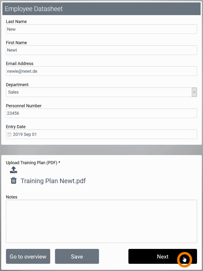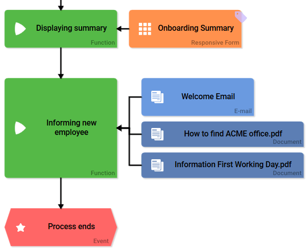 Now everyone involved may review the data once more in a summary. As a last process step an email with predefined attachments is sent to the new employee. The process ends after the email has been sent: