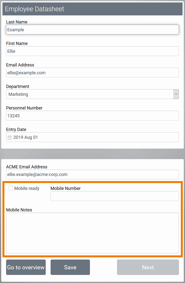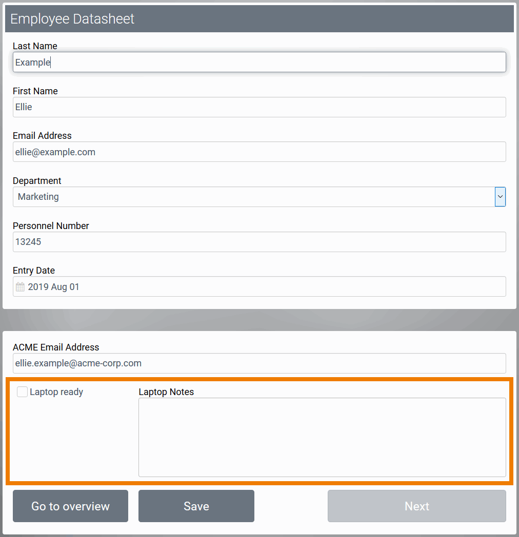 Once the process step Creating email address is finished, the parallel execution starts. The employee editing the instance gets a list of the next steps to be completed. He may decide which step he would like to finish first: Configuring laptop or Configuring mobile phone. The next form to be filled appears according to his choice. He could also use the button Cancel to close the list or Go to overview if he wishes to finish his tasks later: