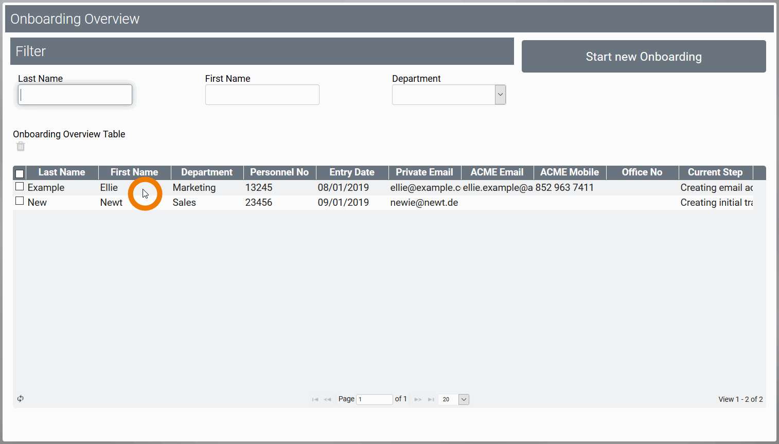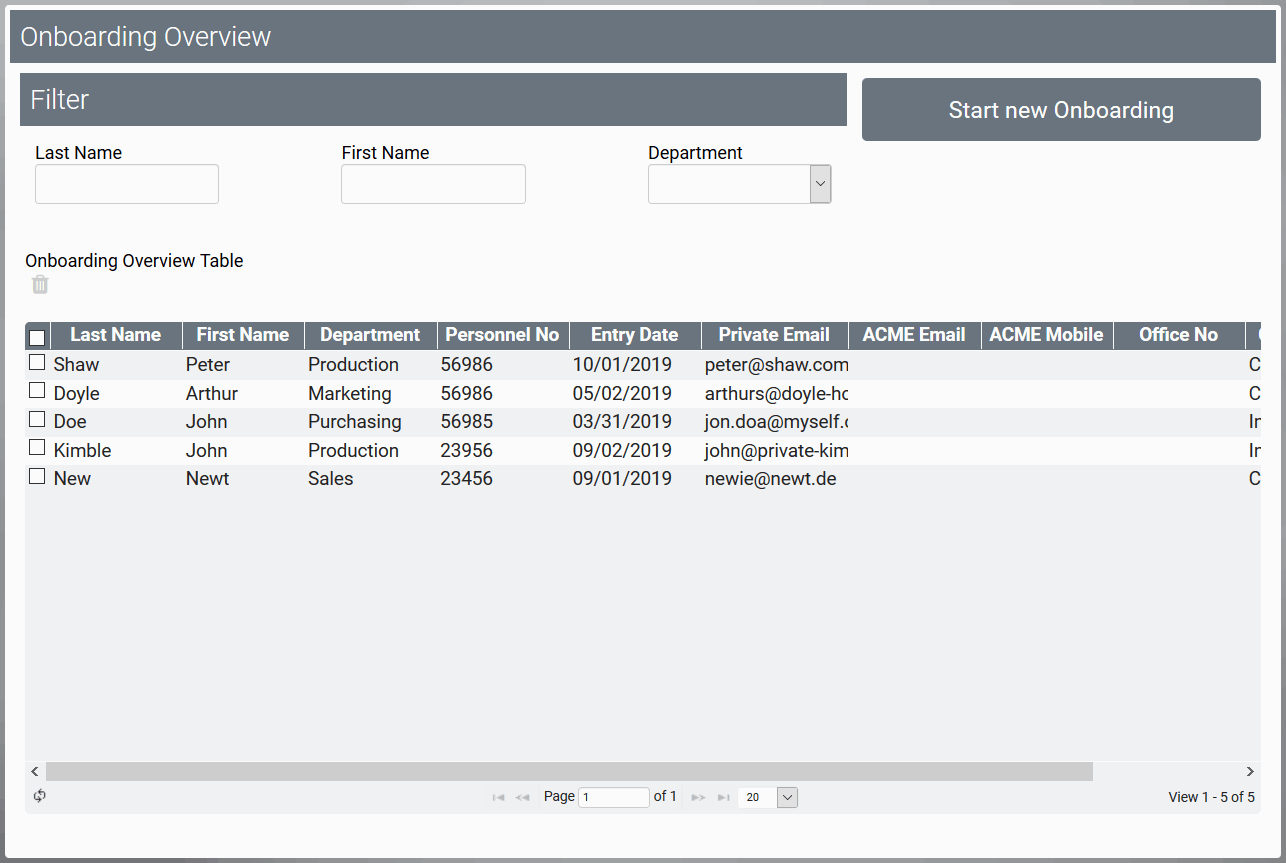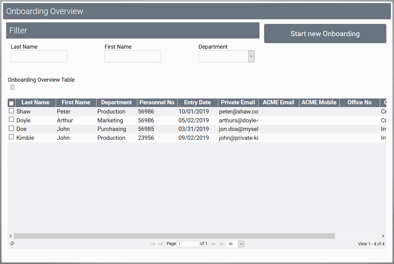 Example: The filter of the start link Onboarding Worklist IT is set to display all IT relevant process steps. According to the filter, all of the IT department's unfinished instances are displayed in the overview: