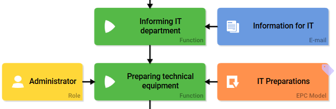 The process branches of the IT and the Facility Management contain multiple steps. In order to keep the model clear, the next steps of the IT department are recorded in the sub-EPC IT Preparations:
