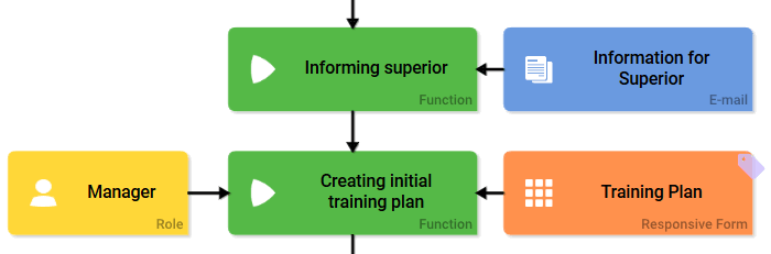 While modeling further process steps inside the AND bracket you may use all available EPC elements. In the ACME onboarding process, in the first step after the start of parallel execution emails are sent to all departments involved. This is to inform participating employees regarding the new tasks waiting in their onboarding worklist: