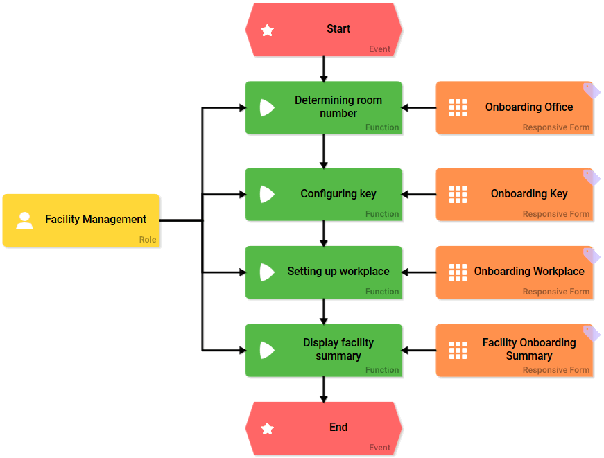 These steps are processed one after the other. The employee completes form Onboarding Office, then finishes the following process steps Onboarding Key, Onboarding Workplace and Facility Onboarding Summary one after another: