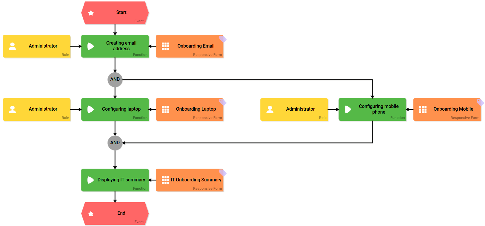 During the ACME Onboarding Process, the IT employee has the choice whether he first wants to edit the step Configuring laptop or whether he starts with the task Configuring mobile phone: