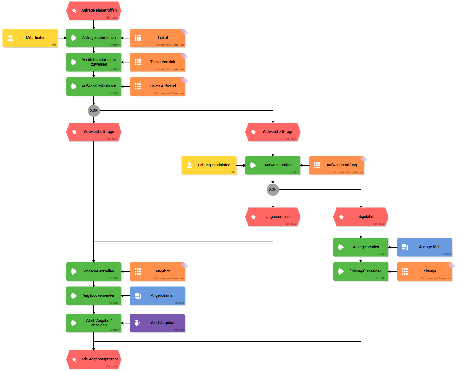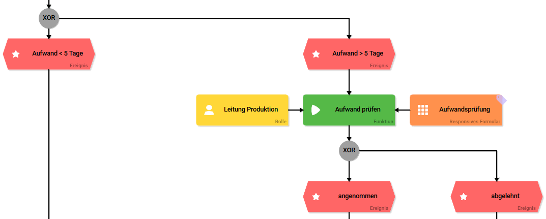 Zunächst wird über die XOR-Verzweigung geprüft, ob der Aufwand unter oder über fünf Arbeitstage liegt. Anfragen für Aufträge mit einer Dauer von bis zu fünf Arbeitstagen benötigen keine weitere Prüfung, der Prozess läuft an dieser Stelle direkt weiter in die Angebotserstellung. Anfragen für Aufträge, deren Bearbeitung über fünf Arbeitstage in Anspruch nimmt, müssen einen weiteren Prüfschritt passieren: Sie werden an die Leitung Produktion gesendet.
