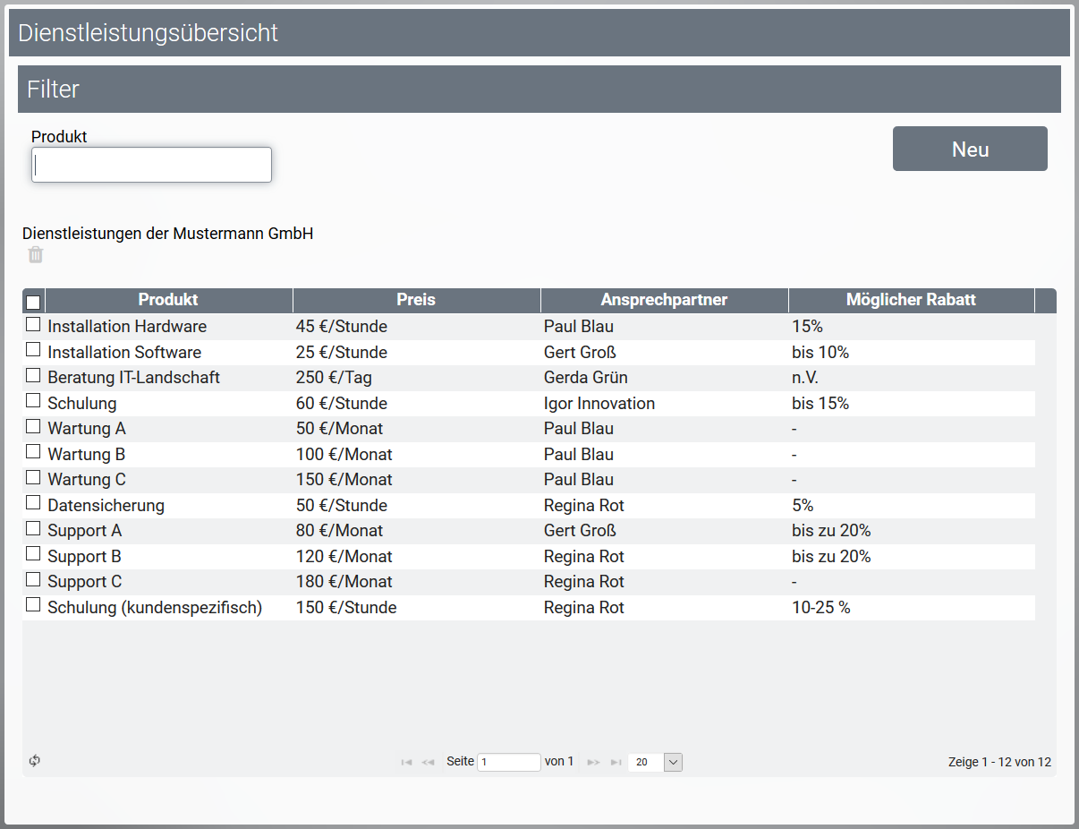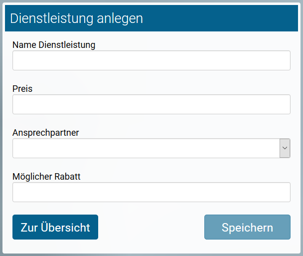 Über die Neuanlage der App wird das Formular Dienstleistungen aufgerufen. Hier kann eine Dienstleistung mit Name, Preis, zuständigem Ansprechpartner und dem möglichen Rabatt eingegeben werden: