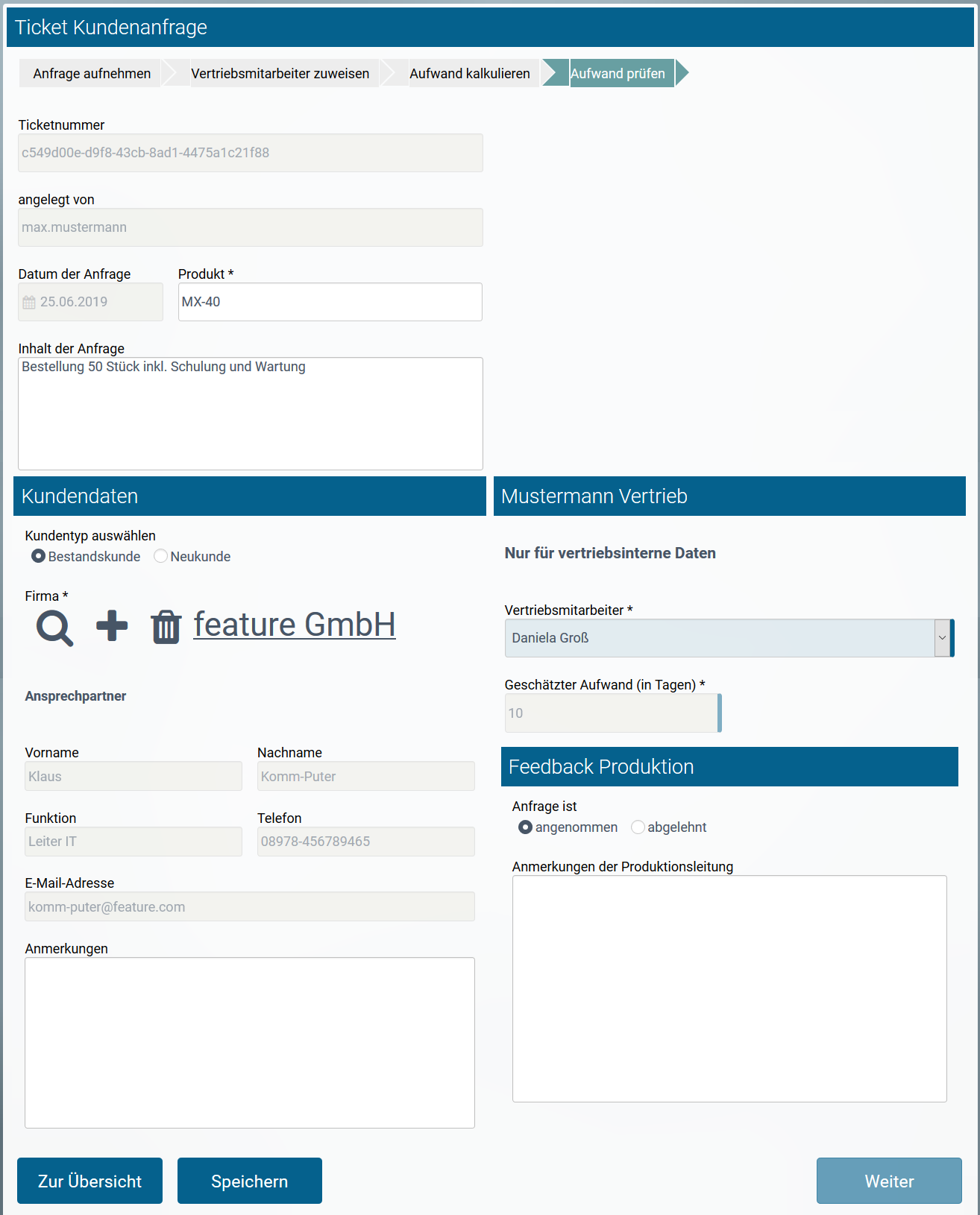 Der Leiter der Produktion prüft, ob die Kapazitäten der Firma ausreichen, um ein entsprechendes Angebot abgeben zu können. Sein Feedback gibt er im Formular Aufwandsprüfung ein.