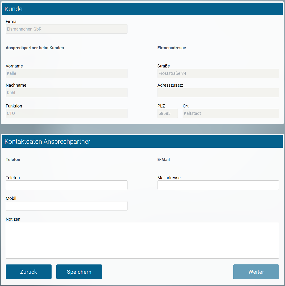 Über die Neuanlage der App wird das Formular Kunde geöffnet. Hier werden der Name der Firma und der Name des Ansprechpartners beim Kunden inklusive seiner Funktion im Unternehmen eingegeben: