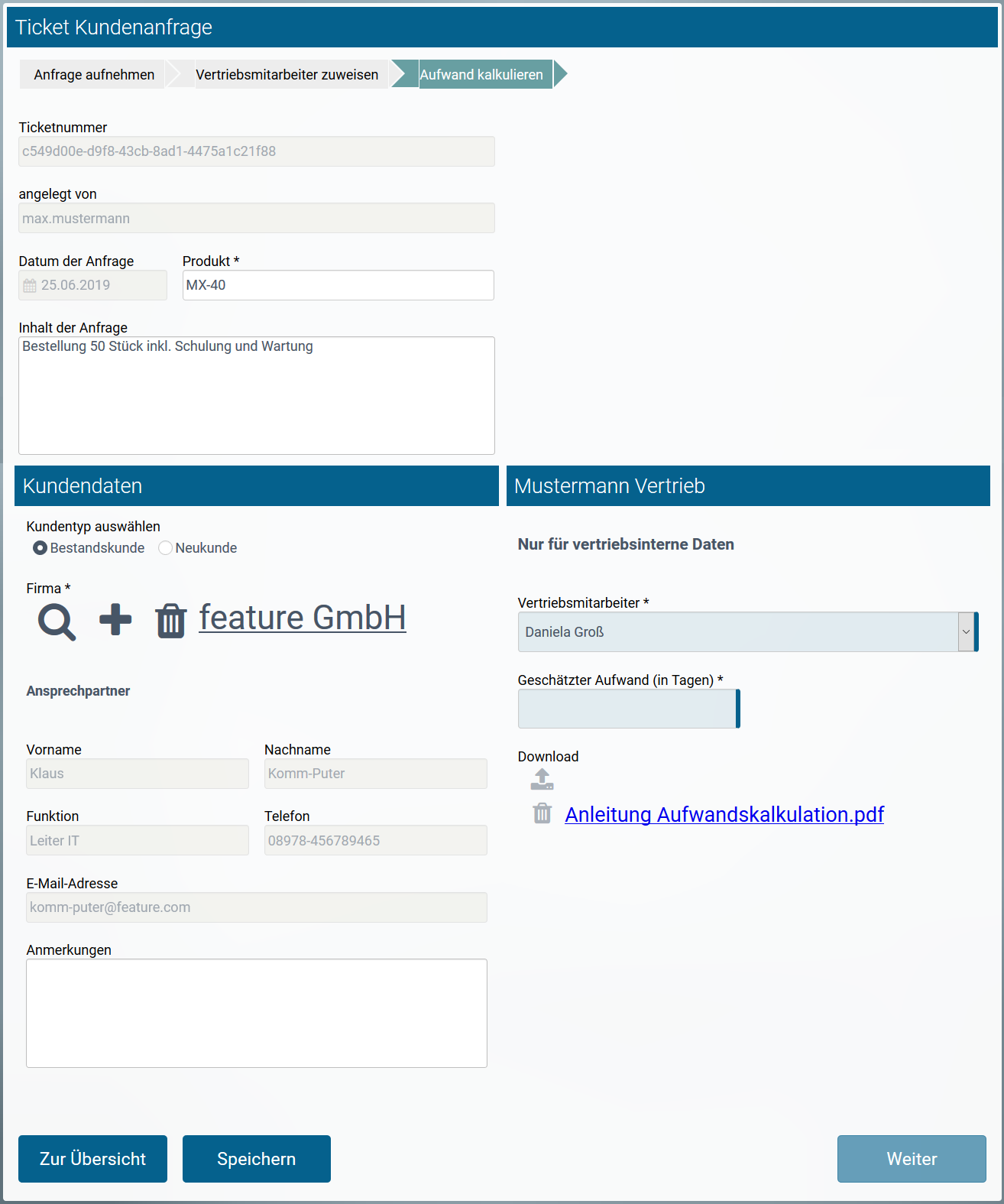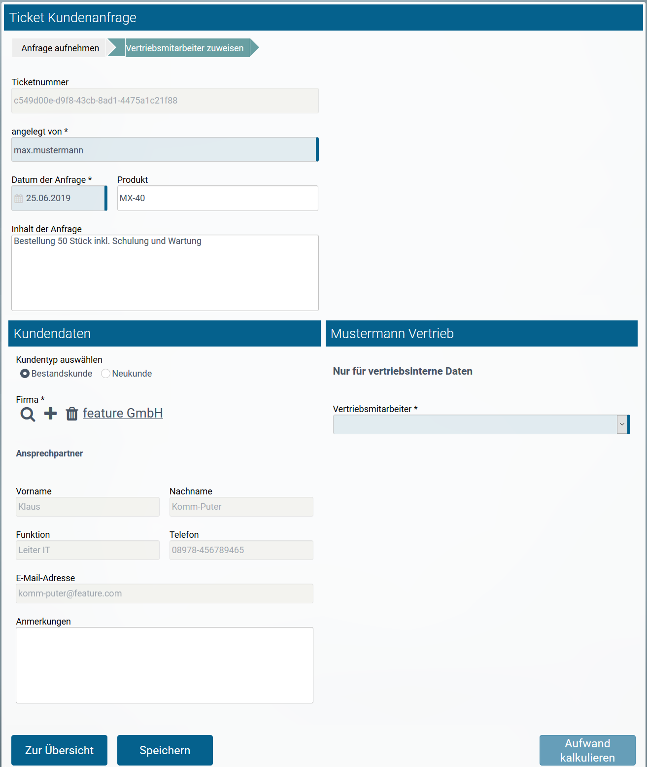 Erstellte Tickets werden im Anschluss einem Vertriebsmitarbeiter zugewiesen.