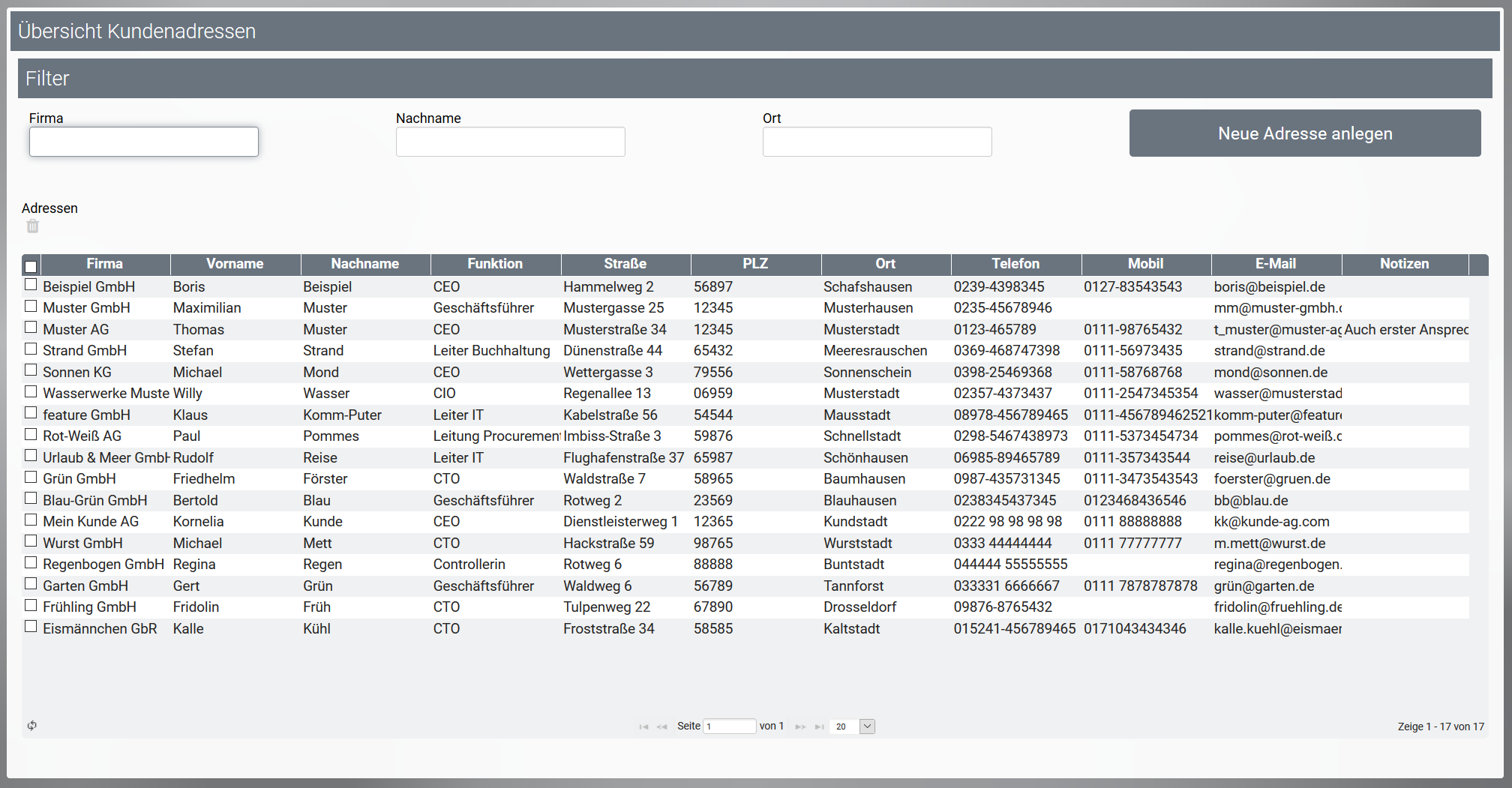 Die Übersicht der App Kundenadressen enthält die Daten aller bereits angelegten Kunden: