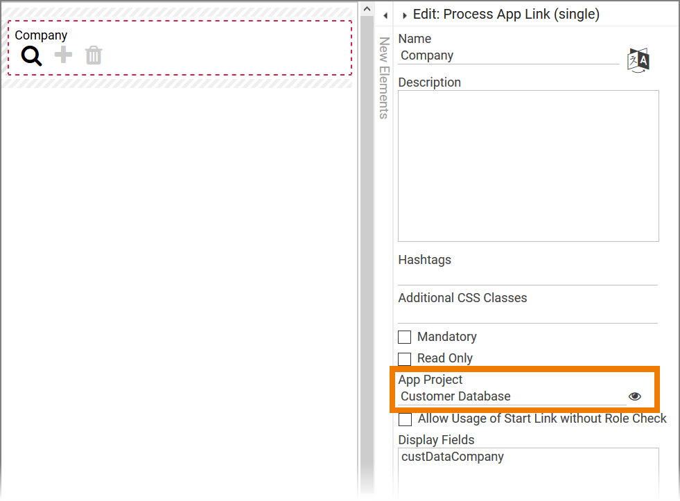 Irene Adler want to reuse content from the Customer Database app in the Proposal Preparation app. So she creates the app link Company in the first form of the Proposal Preparation app and enters the name of the app project she wants to link in field App Project: Customer Database.