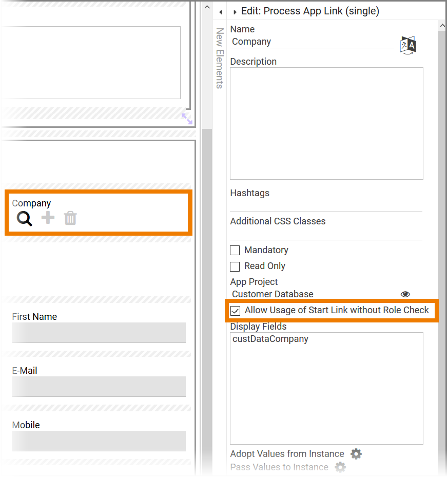 Irene wants to make sure that the app link Company in the Proposal Preparation app can be used in any case. As she already created start links without role check in the Customer Database app, she goes to the app link Company and activates the option Allow Usage of Start Link without Role Check. If the role-specific start link cannot be found for technical reasons, the app link Company now can be used anyway: