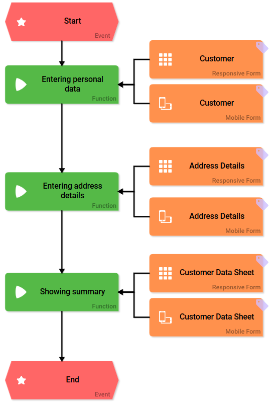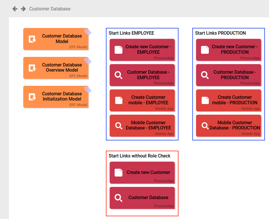 In the Customer Database app, Irene has also created start links without role check in addition to the role-specific Process Apps. These links allow design users like Irene to run through the app in one go without having to change roles - for testing purposes, for example.
