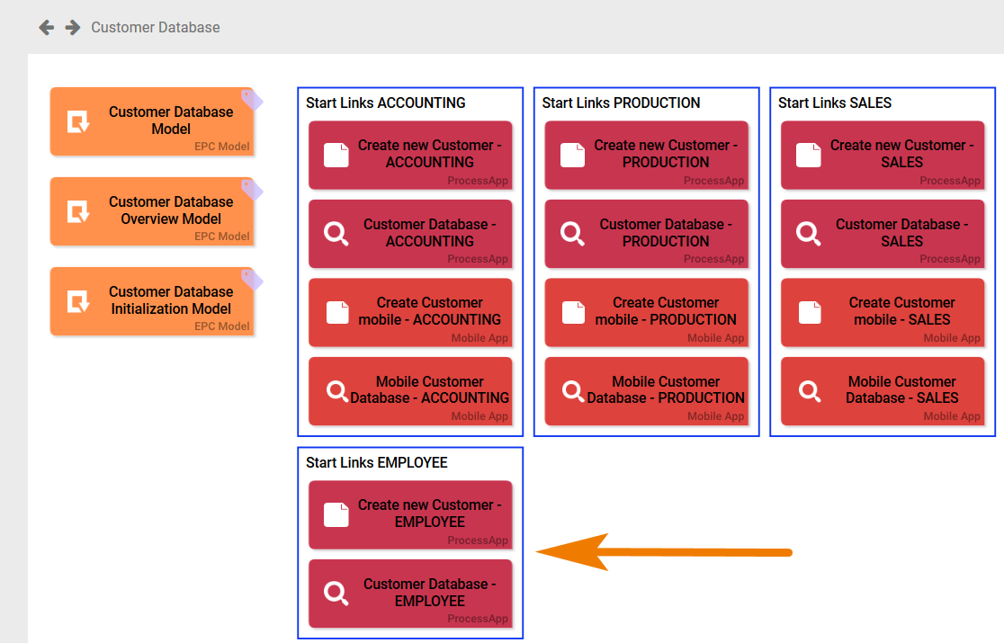 Then Irene creates the corresponding start links for the roles in the Customer Database app: