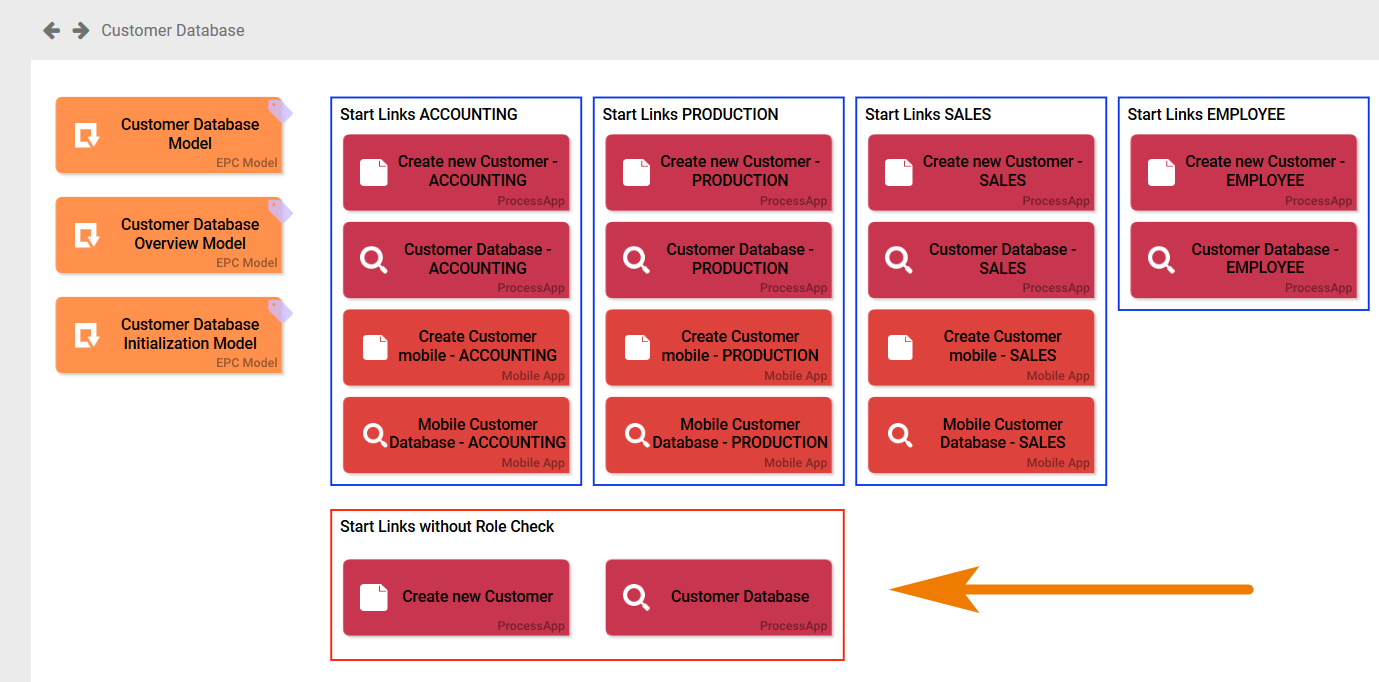 Therefore, no role-specific start links have been created in the app project Customer Database so far: