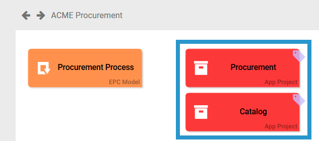 Example | The App Projects Procurement and Catalog, both belonging to the EPC Procurement Process, have been created in the BPaaS Project Editor. Since they are used as start links to a further level of the editor (similar to the element Procurement Process) those elements are not linked via connections. ![]() |