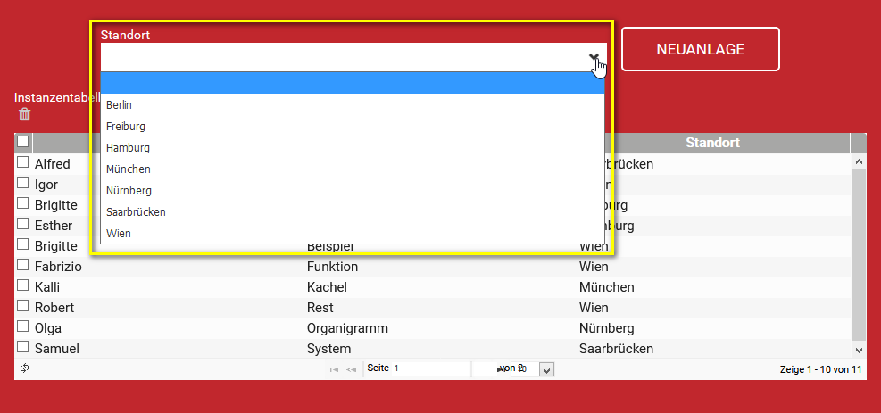 In der Suchübersicht möchte man die Instanzen nach den möglichen Standorten filtern. Da über das Coding alle erlaubten Standorte definiert sind, bietet sich als Filter eine Auswahlliste an: