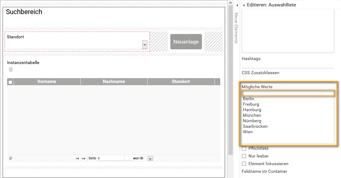 Damit die Filterung funktioniert, müssen die folgenden Voraussetzungen erfüllt sein: Die Auswahlliste, die als Filter dient, muss als Mögliche Werte alle erlaubten Standorte enthalten. Damit es auch möglich ist, alle Instanzen anzuzeigen, sollte in den Möglichen Werten auch ein Leerwert enthalten sein: