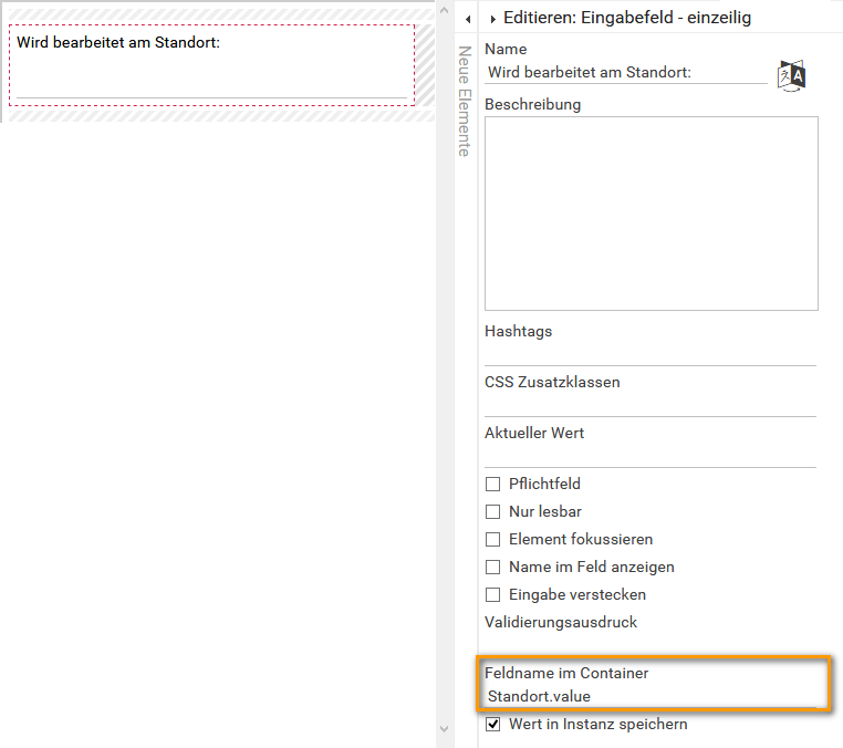Die Werte einer Auswahlliste werden immer als Wertepaar value und label gespeichert (vgl. Seite Possible Values: Value and Label). Eine Auswahlliste prüft auf die values. Der Feldname im Container des Felds, in dem der vorbelegte Standort angezeigt wird, muss daher um den Eintrag .value ergänzt werden. In unserem Beispiel wird für das Eingabefeld Wird bearbeitet am Standort als Feldname im Container Standort.value eingetragen: