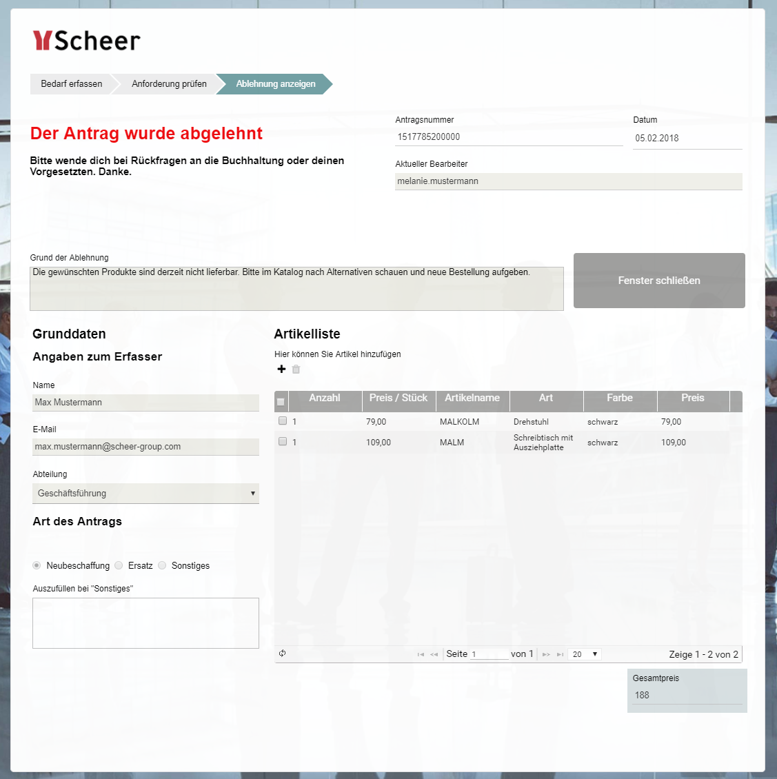 Wenn ein Antrag abgelehnt wurde, wird eine Ablehnungsmail an den Besteller gesendet. Zudem wird ihm im Formular Ablehnung der Grund angezeigt. Anschließend endet der Beschaffungsprozess: