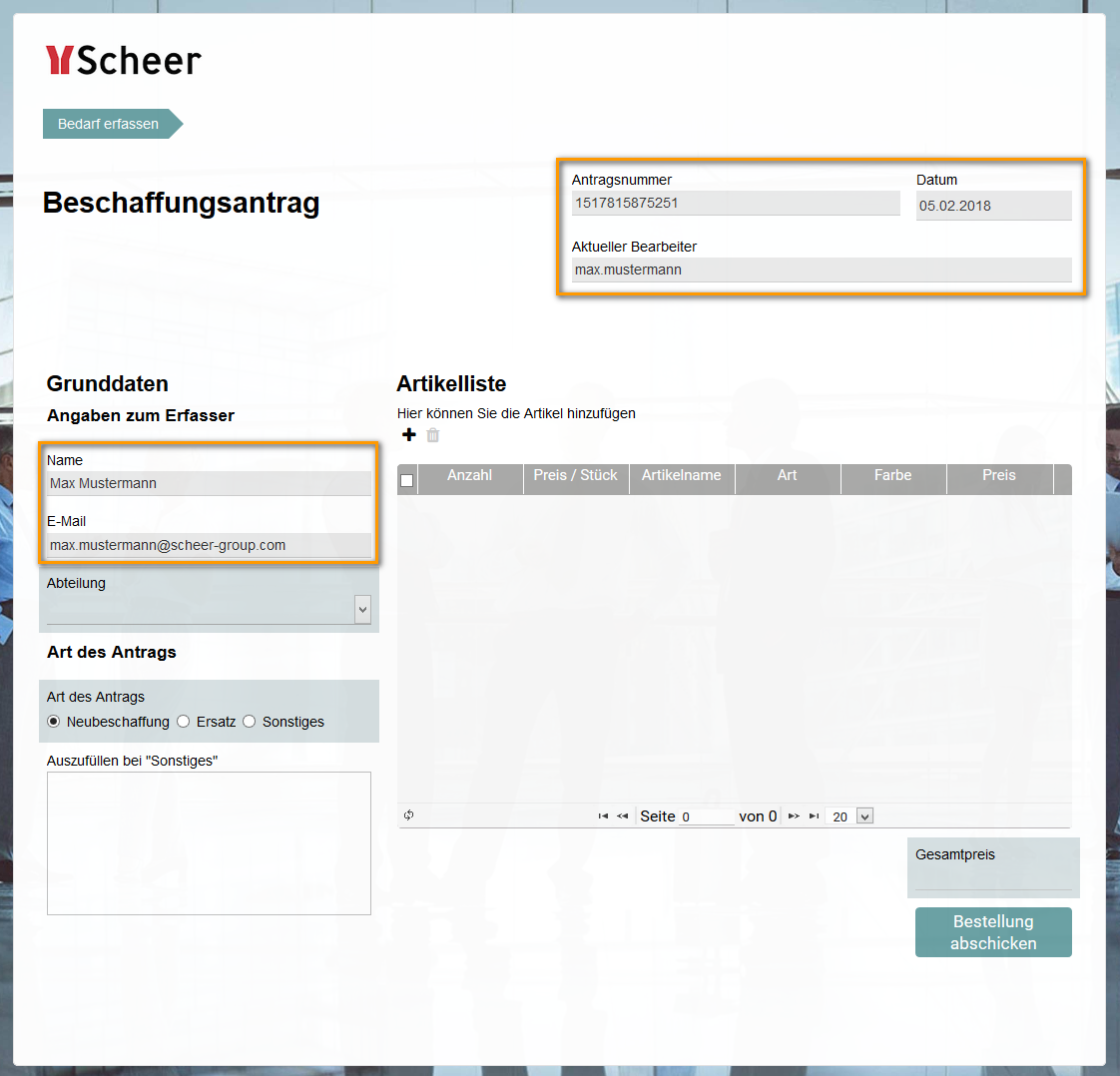Wenn der Antragsteller das Formular Beschaffungsantrag öffnet, wird es ihm mit den entsprechenden Vorbelegungen angezeigt. Die vorbelegten Felder können nicht verändert werden: