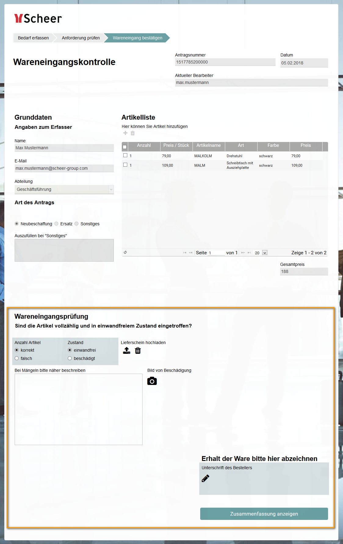 Wenn die bestellte Ware eingetroffen ist, wird der Besteller vom Einkauf entsprechend informiert und muss anschließend die Ware prüfen.