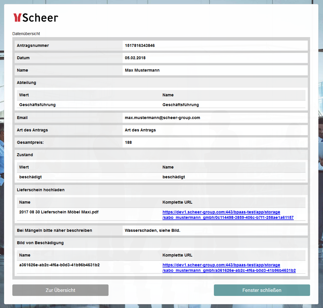 Mit dem Schließen des Formulars Zusammenfassung endet der Beschaffungsprozess.