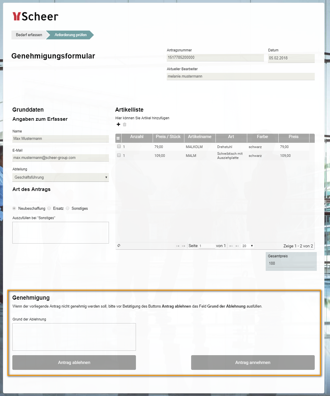 Liegt ein neuer genehmigungspflichtiger Antrag vor, wird eine E-Mail an den Genehmiger versendet. Die Leitung Buchhaltung prüft anschließend über das Genehmigungsformular die Bestellung und entscheidet, ob der Antrag genehmigt wird oder nicht: